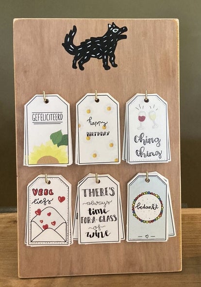 Deze zelfontworpen, gedrukte kaartjes kunnen gebruikt worden voor aan cadeautjes of een fles wijn.